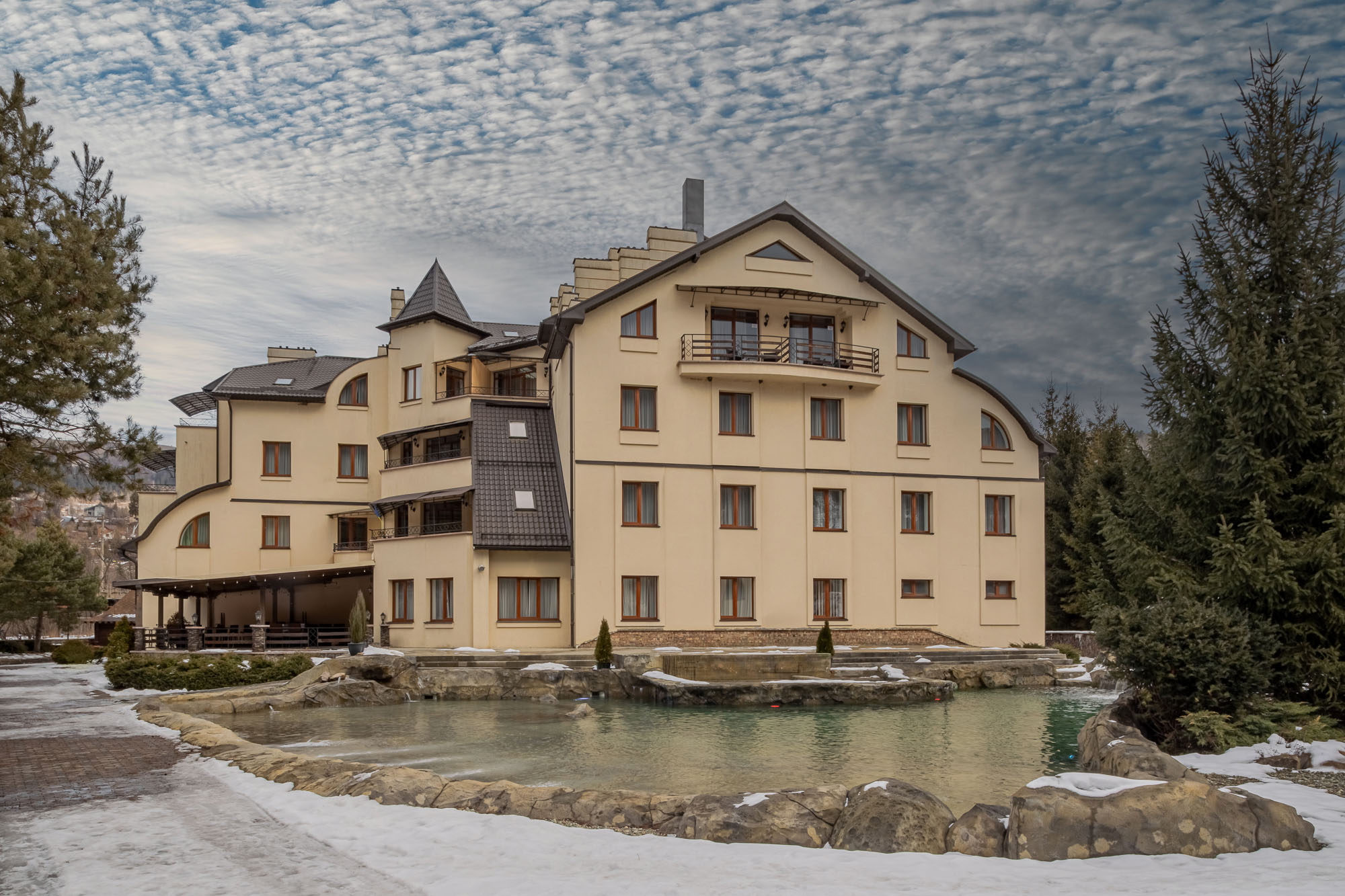 Сьогодні комплекс уже пропонує гостям внутрішню аква-зону з класичною сауною та невеликим басейном для охолодження та відновлення сил.Також вже влаштовано сучасний відкритий басейн. Це дозволить гостям насолоджуватися плаванням просто неба з виглядом на карпатські вершини, що є ключовим магнітом для туристів у будь-який сезон.