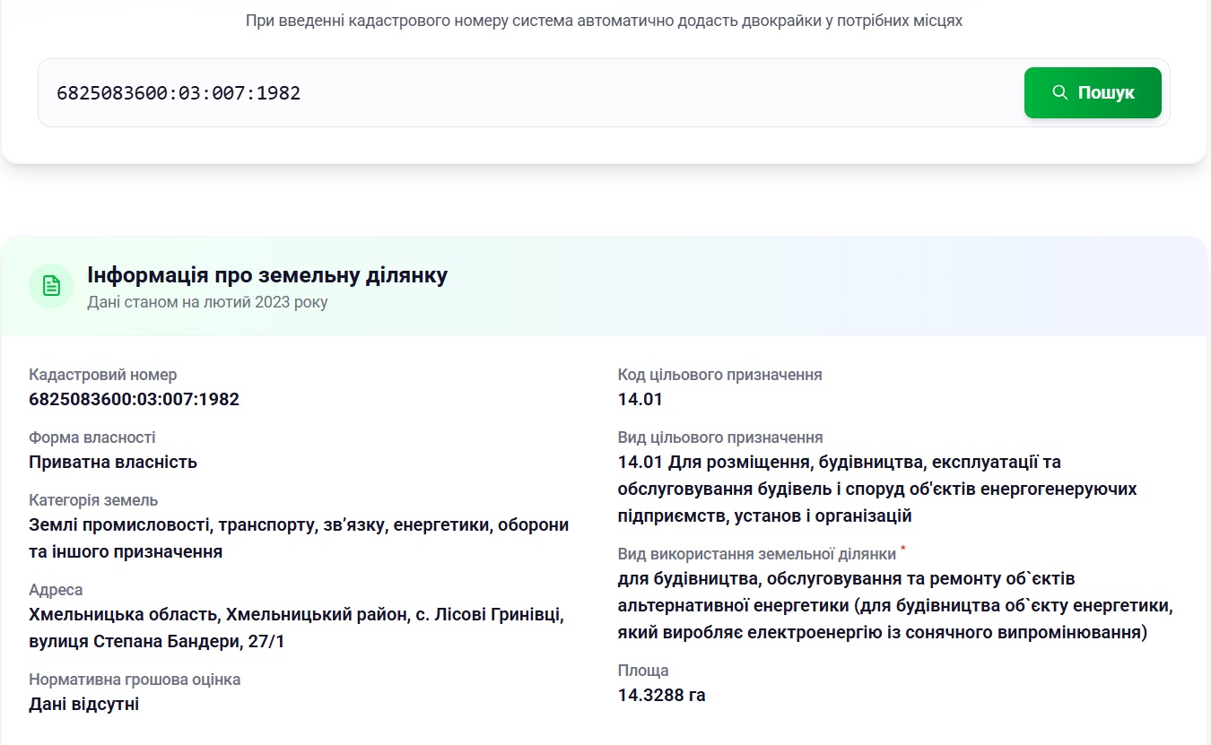 Продам велику земельну ділянку в передмісті Хмельницького, Лісові Гринівці. Площа: 14,3288 Га Вартість: 788 000$ (550$/сотка)+ витрати на переоформлення. Кад.№: 6825083600:03:007:1982 Призначення: 14.01 Для розміщення, будівництва, експлуатації та обслуговування будівель і споруд об'єктів енергогенеруючих підприємств, установ і організацій Власність: приватна. Адреса: Хмельницька область, Хмельницький район, с. Лісові Гринівці, вулиця Степана Бандери, 27/1 Розташування: знаходиться в масиві між СЕС"Лісові Гринівці" Старокостянтинівським шосе. Фасадна частина до траси - 365м.. Гарна інвестиція. Можна змінити призначення під будівництво. Пропозиція від представника власника.