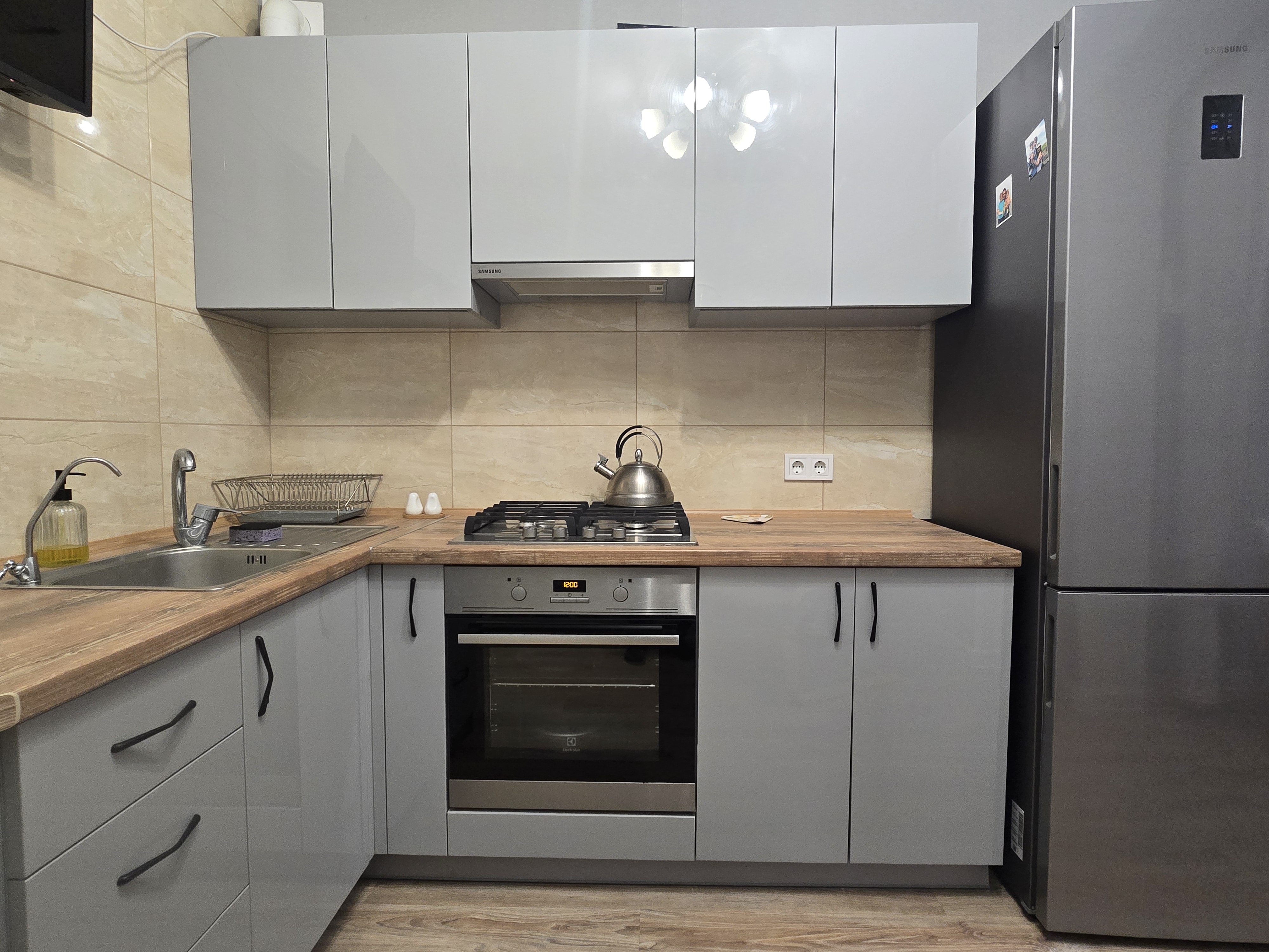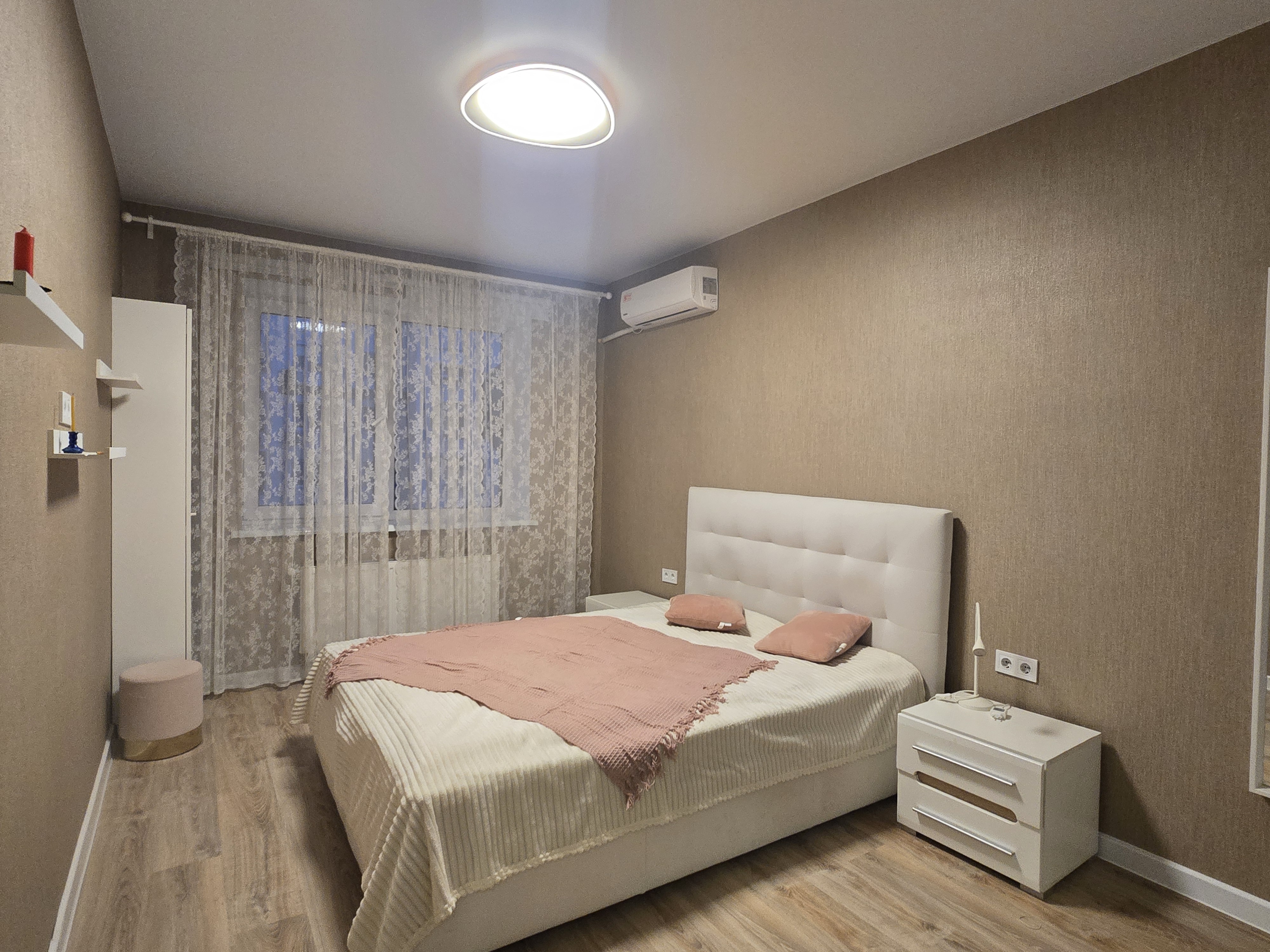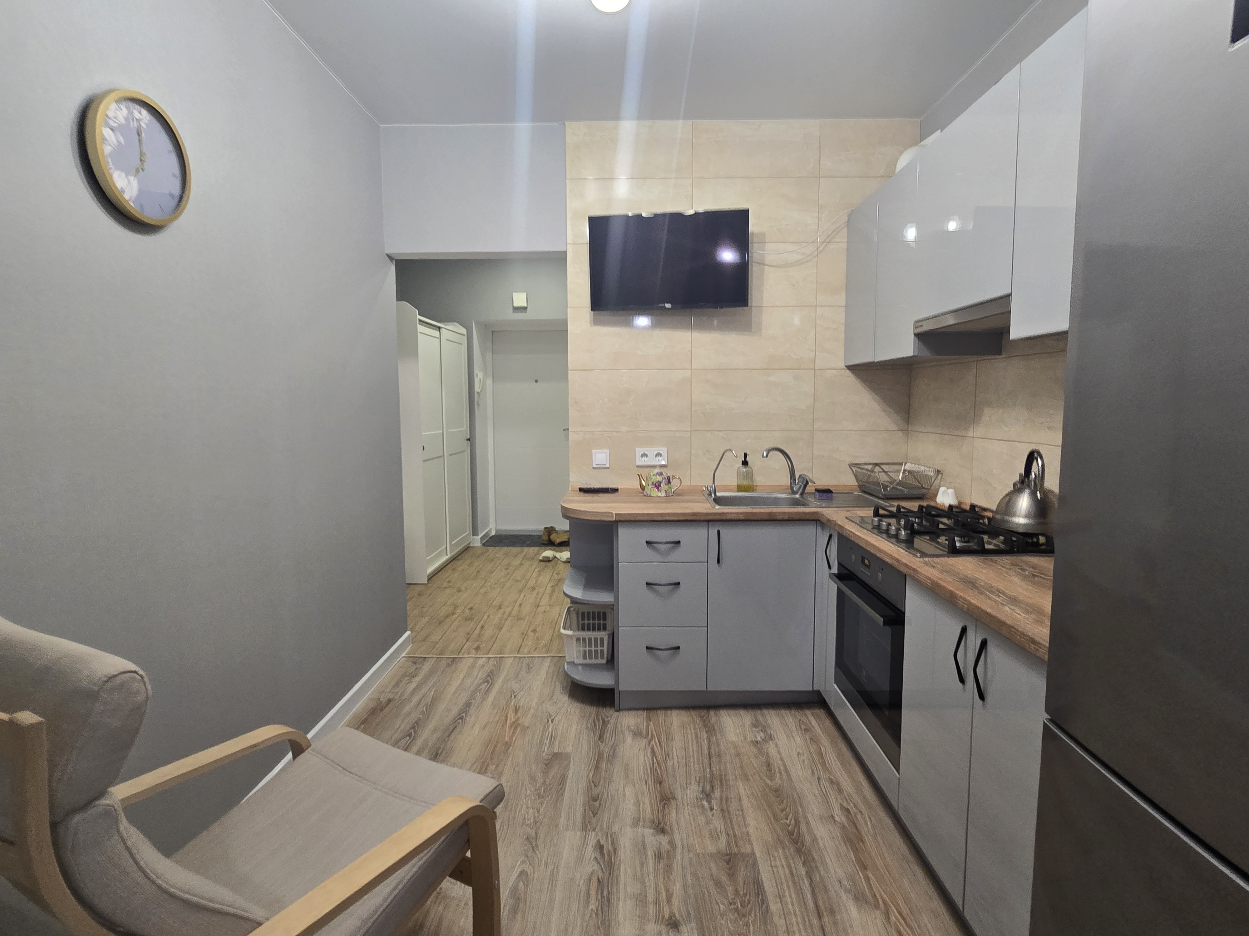 Простір грамотний на 3 повноцінні зони: Кухня з нормальною робочою зоною; Зона столової - лоджії; Повноцінна спальна кімната з двоспальним ліжком; Гардеробна кімната ну дуже простора;