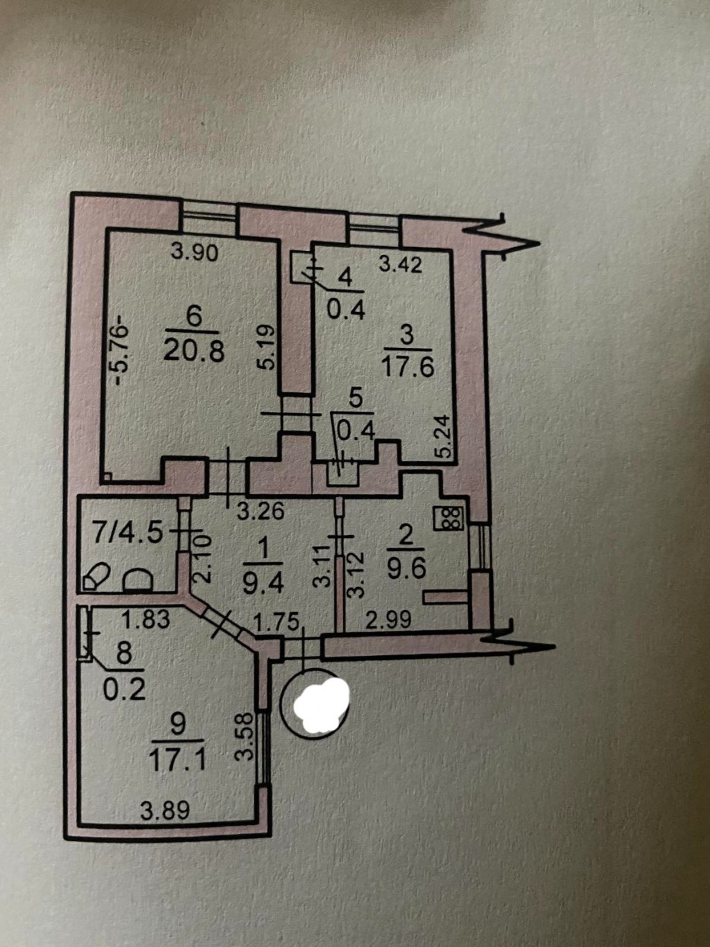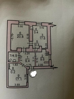 Общая площадь - 80 кв. м, жилая - 55.5 кв. м (20.8 кв. + 17.6 кв. + 17.1 кв. ), кухня - 9.6 кв. м.